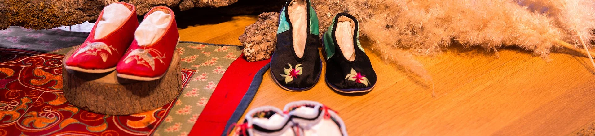 Among the more than 100 pairs of children's shoes in the collection, there are a few pairs from the North and Jiangnan regions, except for the ethnic minorities in the southwest. The shapes of the shoes are different, but the embroidery is always some form of prayer and well wishes for the child. To frighten away evil spirits, mothers often crafted shoes to look like animals, such as tigers, oxen, or pigs so that young children can be bestowed with the strength and ferocity of these animals, should harm come for them. Often, the eyes of the animals are exaggerated and made larger - it is so that children can see where they are going, especially when they are first learning how to walk.